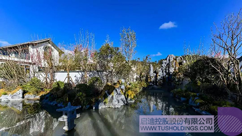 “若水池”畔花香染襟,鱼戏幽池碧波荡漾;“腾越亭”内好友欢聚,浅尝清酌花间呓语;看庭前花开,悦水雾朦胧,心随风,梦随已。