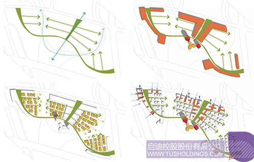 基地被西部干线划分为科研办公和配套居住两个区域,然而科研办公用地又被现状河流分为三个地块,设计之初,希望将三块科研用地作为一个地块设计。通过对场地及周边现状的分析,设计时首先引入一条自由的曲线,将三个独立的地块有机的串联在一起,使之形成一个整体;同时又在中间地块引入一条南北方向的轴线与自由的曲线相呼应形成园区的主要结构轴线;将其打造为集景观、交通、配套服务等功能为一体的公共服务轴。