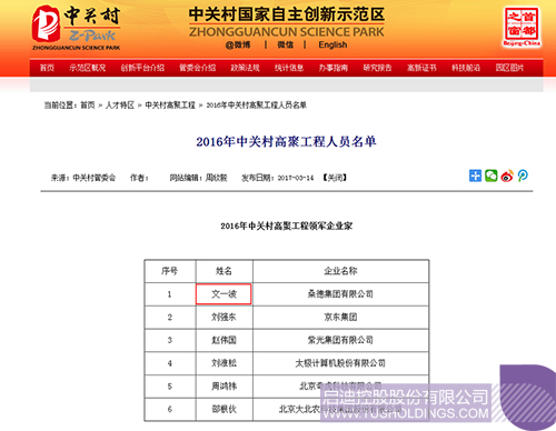 九游·官方版在线入口桑德董事长文一波入选“2016年中关村高聚工程领军企业家”打印
