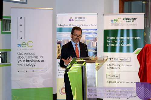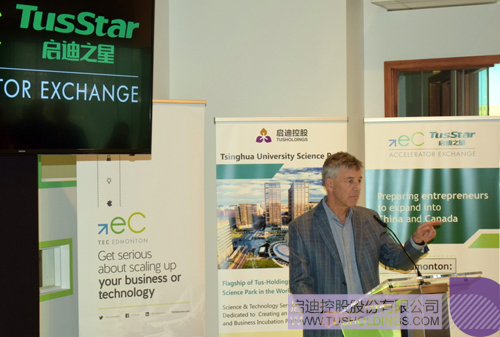 Dr.Matthius Ruth分享了阿尔伯塔大学与清华大学的合作历程,他表示很高兴看到高校的交流带动了双方产学研促进机构的合作,期待双边技术交流和孵化的成果能早日呈现。