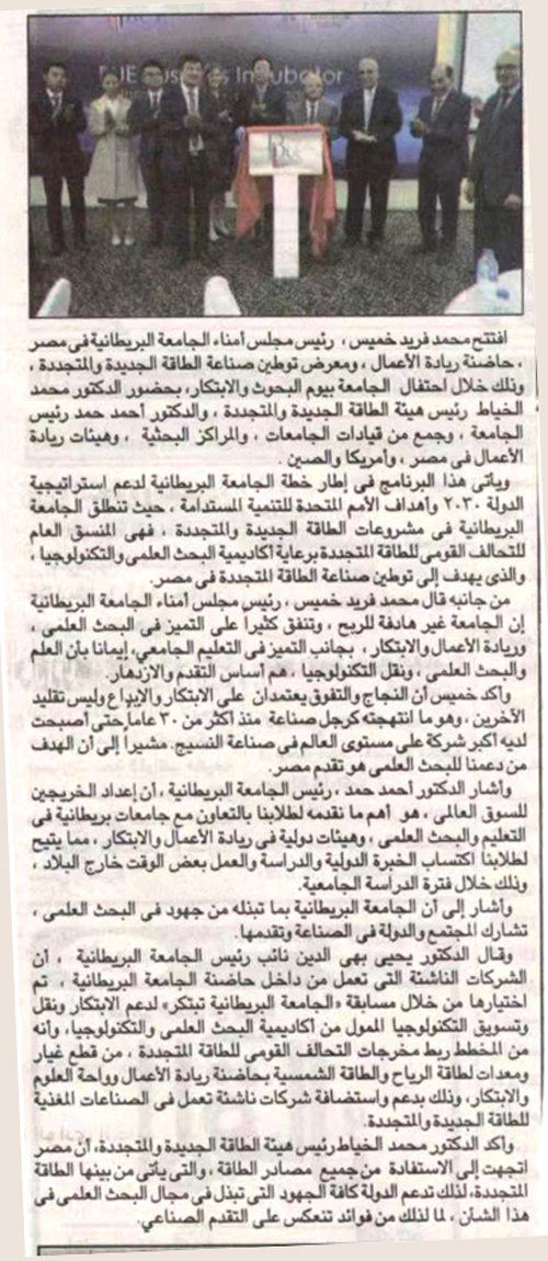 根据埃及《金字塔报》报道内容编译:近日,埃及大不列颠大学举办了创业孵化器启动仪式以及“新能源和可再生能源产业本地化展览会”开幕仪式,埃及大不列颠大学董事会主席穆罕默德·法里德·哈米斯、埃及新能源与可再生能源机构主席穆罕默德·哈耶图博士、埃及大不列颠大学校长艾哈迈德·哈姆德博士、九游·官方版在线入口控股常务副总裁陈鸿波、美国国际开发署(UASID)经济开发办公室主任D·Brinton Bohling,以及来自埃及、美国和中国的大学、研究机构与创业企业代表出席活动。