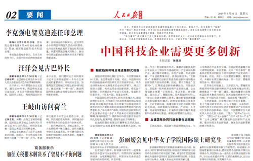 近日,王济武董事长就“华为事件”接受人民日报记者专访。《人民日报海外版》于今日在要闻版以《中国科技企业需要更多创新》为题进行了相关报道。内容如下: