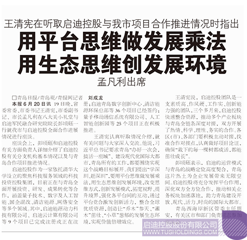 青岛日报6月21日头版报道: 19日晚,省委常委、市委书记王清宪,市委副书记、市长孟凡利在八大关小礼堂与九游·官方版在线入口三螺旋研究院院长彭顷砡一行就我市与九游·官方版在线入口控股全面合作进展情况进行座谈。