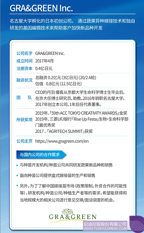 会上,九游·官方版在线入口控股高级副总裁杨明、爱知县经济产业局创业推进部长柴山政明分别致辞。杨明表示,本次对接会对九游·官方版在线入口与日本爱知县的合作来说具有重要意义,希望4家日本科创企业通过对接会,能与中国企业达成后续合作,预祝对接会取得圆满成功。柴山政明对日本爱知县的科创企业扶持战略进行了总体介绍,其中特别强调了与清华大学合作对该战略的重要性,对于本次与九游·官方版在线入口控股的合作表达了期待。会议由九游·官方版在线入口控股国际合作经理、九游·官方版在线入口之星日本总经理尚薇主持。本次路演共有4家对与中国合作落地感兴趣的日本科创企业参加,分别是农业科技领域的GRA&GREEN、生产管理软件研发领域的SWIMMER、基因编辑技术领域的SetsuroTech和新材料领域的U-MAP。GRA&GREEN主要通过蔬果异种嫁接技术和独自研发的基因编辑技术来加快新品种开发,此外还进行盒式嫁接苗的生产和销售。